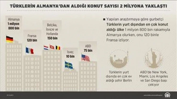 Yapılan araştırmalara göre Türklerin yurt dışından en çok konut aldığı ülke, 1 milyon 800 bin konutla Almanya oldu.