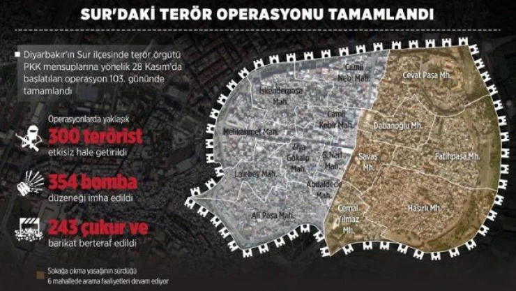 AA muhabirinin güvenlik kaynaklarından aldığı bilgiye göre, 28 Kasım 2015'te Diyarbakır Baro Başkanı Tahir Elçi'nin hayatını kaybettiği, polis memurları Ahmet Çiftaslan ve Adem Erdur'un şehit edildiği saldırının ardından terör örgütü PKK mensuplarının yakalanması, kamu düzeninin sağlanması, barikatların kaldırılması, çukurların kapatılması ve patlayıcıların imhası için başlatılan operasyon, 103. gününde tamamlandı.