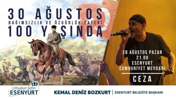 Esenyurt Belediyesi, 30 Ağustos Zafer Bayramı kutlamaları çerçevesinde ünlü rap sanatçısı Ceza’yı Esenyurtlularla buluşturacak.