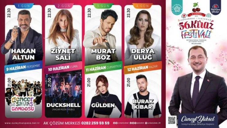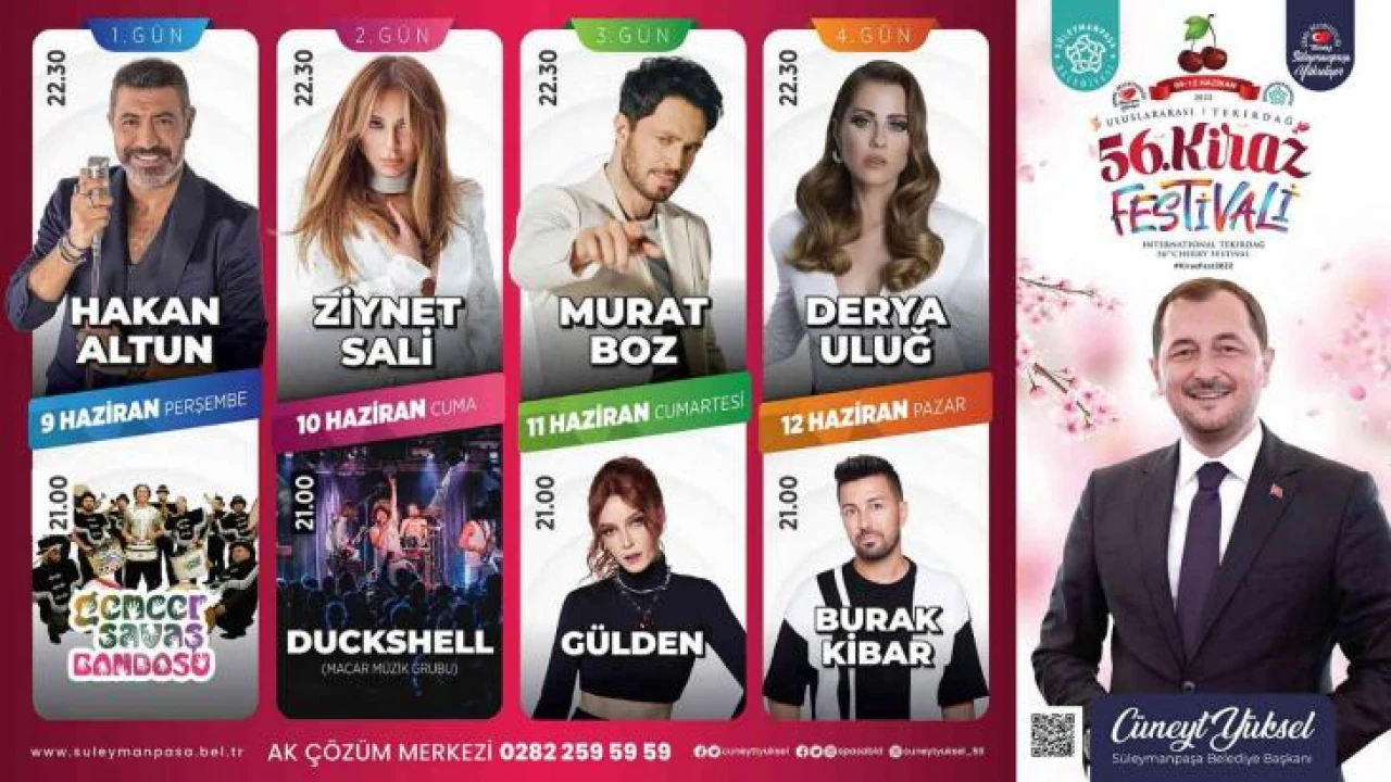 Tekirdağ Süleymanpaşa Belediyesi tarafından organize edilen ve bu yıl 56'ncısı düzenlenecek olan Uluslararası Tekirdağ Kiraz Festivali, 9-12 Haziran 2022 tarihleri arasında gerçekleştirilecek. Çok sayıda etkinliğe ev sahipliği yapacak olan 56. Uluslararası Tekirdağ Kiraz Festivali'nin programı belli oldu.