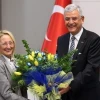 Bozkır'a, çalışanlar adına, AB'yi temsilen sarı lacivert renklerde çiçek verildi. Galatasaraylı olduğunu belirten Bozkır, Fenerbahçe renklerindeki çiçekler için teşekkür etti.