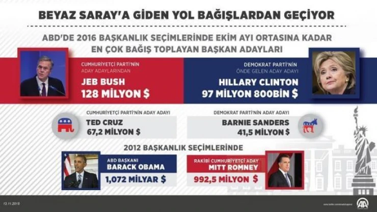 Bush, geçen yılın ekim ayına kadar yaklaşık 128 milyon dolarla en çok bağışı toplamış, Clinton ise 97 milyon 800 bin dolarla ikinci sırada gelmişti.
