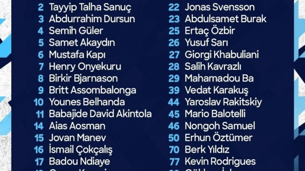 "Tayyip Talha Sanuç (2), Abdurrahim Dursun (3), Semih Güler (4), Samet Akaydın (5), Mustafa Kapı (6), Birkir Bjarnason (8), Babajide David Akintola (11), Aias Aosman (14), Jovan Manev (15), İsmail Çokçalış (16), Goran Karacic (18), Hijran Ali Boyacı (19), İzzet Çelik (20), Arda Okan Kurtalan (21), Jonas Svensson (22), Abdulsamet Burak (23), Ertaç Özbir (25), Yusuf Sarı (26), Giorgi Khabuliani (27), Salih Kavrazlı (28), Mahamadou Ba (29), Vedat Karakuş (39), Yaroslav Rakitskiy (44), Nongoh Samuel (46), Erhun Öztümer (50), Berk Yıldız (70), Kevin Rodrigues (77), Benjamin Stambouli (90), Simon Deli (91), Ali Yavuz Kol (99).”