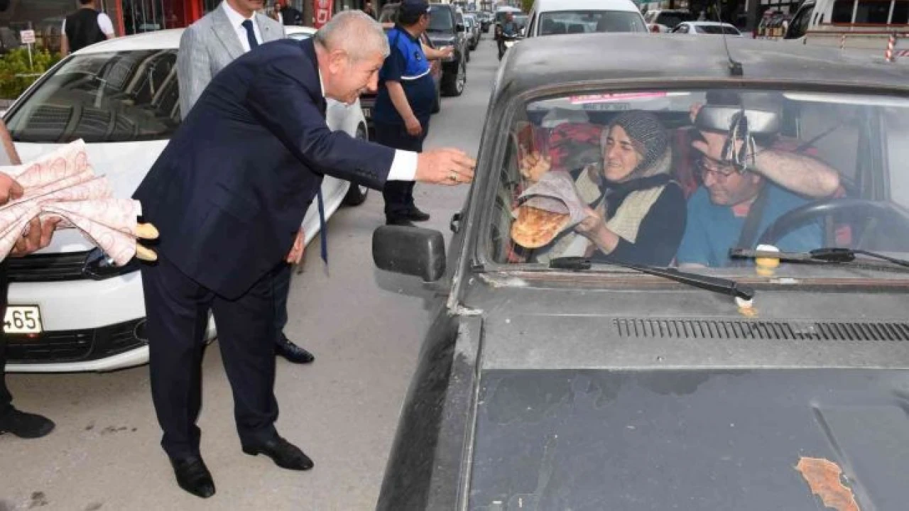 Amasya Belediye Başkanı Mehmet Sarı, iftar öncesi trafikte araçlarda bulunan vatandaşlara pide dağıtıp hayır duası istedi.