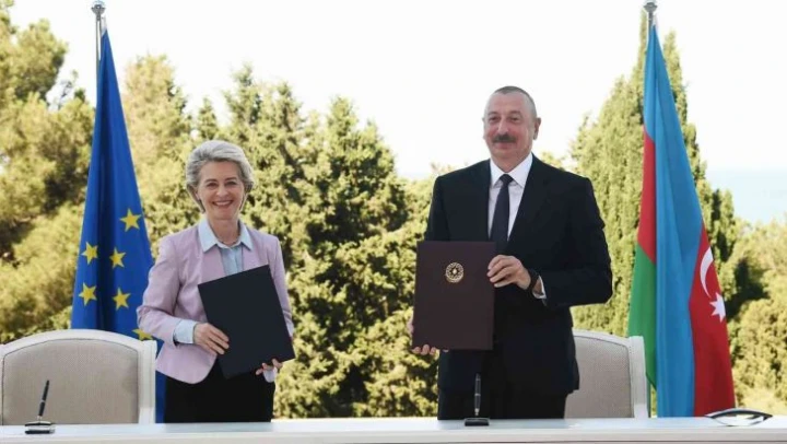 Azerbaycan Cumhurbaşkanı İlham Aliyev, Avrupa Birliği (AB) Komisyonu Başkanı Ursula von der Leyen ile yaptığı ortak basın toplantısında, “Azerbaycan'ın ileri sürdüğü, AB ve ortaklarımız tarafından desteklenen enerji projeleri, Avrupa'nın enerji haritasını tamamen değiştirdi” dedi. Azerbaycan ile AB arasında enerji alanında stratejik ortaklık hakkında mutabakat zaptı imzalandı.