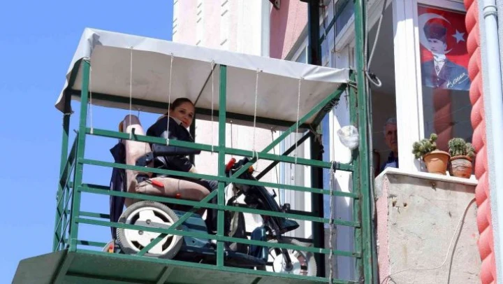Edirne'nin Talatpaşa Mahallesi'nde yaşayan 46 yaşındaki Mübessel Yolalmaz, 4 yaşında geçirdiği çocuk felci rahatsızlığı nedeniyle yürüyemiyor. Daha önce anne ve babasının sırtında taşıyarak merdivenlerden indirdiği ardından da akülü tekerlekli sandalyesine bindirdikleri Yolalmaz, Edirne Belediyesi'nin desteğiyle evinin dışına asansör yaptırdı.
