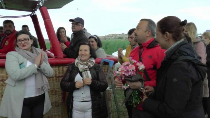 Kapadokya bölgesini gezmeye gelen Fatma Karaca, balonla gökyüzüne yükselecek olmanın heyecanını yaşadığını, çiçekle karşılanmasının ise ayrı bir mutluluk olduğunu belirterek, 'Güne başlarken çiçek almaktan dolayı çok mutlu oldum. Tüm annelerin günleri kutlu olsun.' dedi.