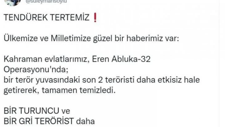 'Tendürek tertemiz Ülkemize ve Milletimize güzel bir haberimiz var: Kahraman evlatlarımız, Eren Abluka-32 Operasyonu'nda; bir terör yuvasındaki son 2 teröristi daha etkisiz hale getirerek, tamamen temizledi. Bir turuncu ve bir gri terörist daha sarı torbada.'