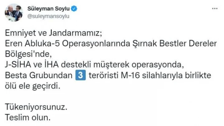İçişleri Bakanı Süleyman Soylu, Şırnak'ta devam eden Eren Abluka-5 Operasyonları kapsamında, J-SİHA ve İHA destekli müşterek operasyon ile Besta Grubu mensubu 3 teröristin silahlarıyla birlikte ölü ele geçirildiğini duyurdu. Konuyla ilgili sosyal medya hesabından paylaşımda bulunana Bakan Soylu, 'Emniyet ve Jandarmamız; Eren Abluka-5 Operasyonlarında Şırnak Bestler Dereler Bölgesi'nde, J-SİHA ve İHA destekli müşterek operasyonda, Besta Grubundan 3 teröristi M-16 silahlarıyla birlikte ölü ele geçirdi. Tükeniyorsunuz. Teslim olun' ifadelerine yer verdi.
