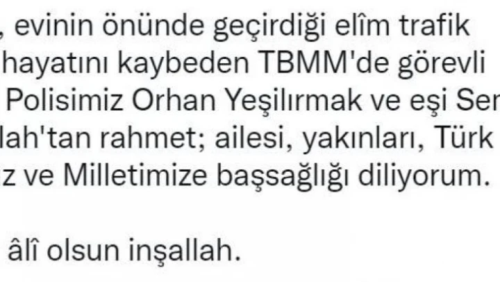 'Ankara'da, evinin önünde geçirdiği elim trafik kazasında hayatını kaybeden TBMM'de görevli Kahraman Polisimiz Orhan Yeşilırmak ve eşi Semiha Hanıma Allah'tan rahmet; ailesi, yakınları, Türk Polis Teşkilatımız ve Milletimize başsağlığı diliyorum. Makamları lî olsun inşallah.'