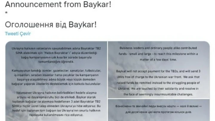 Baykar'ın sosyal medya hesabından yaptığı duyuruda, "Kamuoyunun tanıdığı isimler, gazeteciler, sanatçılar, futbolcular, iş insanları, sıradan insanlar, hatta çocuklar bu kampanyanın başarıya ulaşabilmesi adına büyük veya küçük demeden bağışlar yaparak ülkelerini desteklemek için katkıda bulundular. Vatansever Ukrayna halkının belirledikleri hedefe ulaşma arzusu ve dayanışma ruhu bizi de etkiledi. Baykar olarak toplanan bağışlar ile alınması hedeflenen 3 adet Bayraktar TB2 SİHA'yı hiçbir ücret talep etmeden Ukrayna'ya hibe ediyoruz. Bu hedef için toplanan tüm bağışın ise Ukrayna'nın onurlu halkının faydasına kullanılmasını rica ediyoruz" ifadelerine yer verildi.