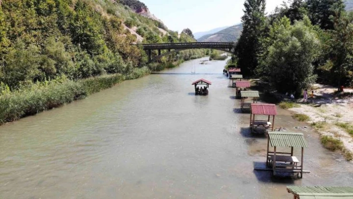 Tokat'ta bunaltan sıcaklarda suyun içerisinde kurulan kamelyada yemek yiyenler hem serinliyor hem de doğa manzarasının keyfini çıkartıyor.