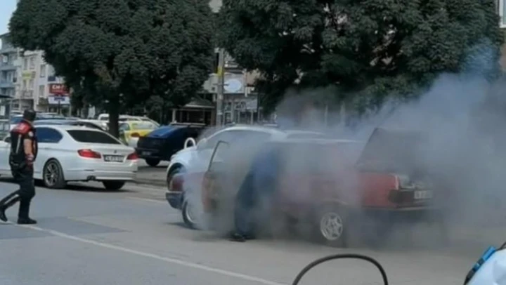 Bursa'nın İnegöl ilçesinde seyir halindeki otomobil cayır cayır yandı. Sürücü, park halindeyken kendiliğinden çalışarak hareket eden otomobilini durdurmak için hayatını tehlikeye attı. O anlar amatör kameraya yansıdı.