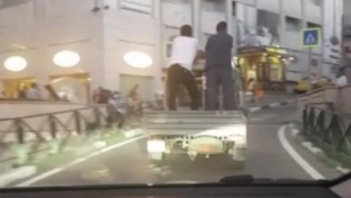 Olay, merkez Osmangazi ilçesi Atatürk Caddesi'nde meydana geldi. Edinilen bilgiye göre, kimliği henüz öğrenilemeyen 2 kişi, canlarını tehlikeye atarak kamyonetin arkasında seyahat etti.