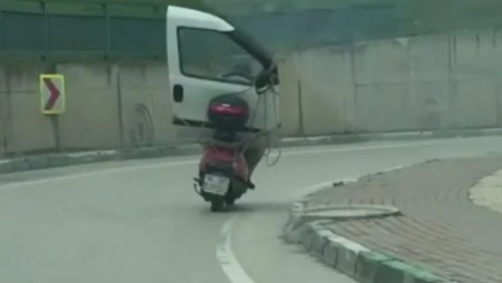 Bursa'da bir kişi motosikletine yüklediği araba kapısıyla yolculuk yapınca görenler şaşkına döndü.