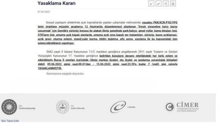 'Sosyal paylaşım sitelerinde açık kaynaklarda yapılan çalışmalar neticesinde; yasa dışı PKK/KCK-PYD/YPG terör örgütüne müzahir gruplarca 12 Haziran'da düzenlenmesi planlanan 'İmralı siyasetine karşı barışı savunmak' için Gemlik'e yürüyüş konusu ile alakalı ilimiz genelinde park/bahçe, genel yollar, kamu binaları önü, STK'ların önü, umuma açık kapalı alanlarda, umuma açık veya kapalı yer toplantıları, yürüyüş, basın açıklaması, açlık grevi, oturma eylemi, stant/çadır kurma, bildiri dağıtma, afiş asma, yazılama ile bu kapsamdaki tüm eylem/etkinliklerin yapılması; 5442 sayılı İl İdaresi Kanununun 11/C maddesi gereğince engellenerek 2911 sayılı Toplantı ve Gösteri Yürüyüşleri Kanununun 17. maddesi gereğince belirtilen konuların devamı niteliğindeki her türlü eylem ve etkinliklerin Bursa il sınırları içerisinde (İlimiz merkez ilçeleri, dış ilçeler ve jandarma sorumluluk bölgeleri dahil) 09.06.2022 günü saat 00.01'den - 15.06.2022 günü saat 23.59'a kadar 7 gün süreyle yasaklanmıştır.'