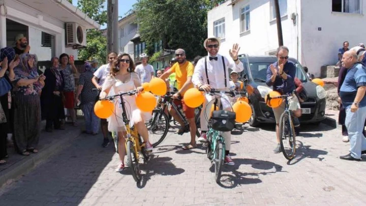 Çanakkale'nin Biga ilçesinde Serap Özçelik (32) ve Sabri Yurdakul (32) çifti, gelin aracı olarak kullandıkları bisikletleriyle düğün konvoy oluşturdu. Arkadaşları da çifte, bisikletleriyle eşlik etti. Sabri Yurdakul arkadaşları ile birlikte düğün öncesi gelini almak için Biga ilçesine bağlı Cumhuriyet Mahallesi Ekinci Sokak'taki gelin evine gittiler. Gelin evinde gelenekler eşliğinde gelini alan damat tarafı daha sonrasında gelin konvoyunu balonlarla süslenen bisikletler eşliğinde gerçekleştirdi. Serap Özçelik yaptığı açıklamada, 'Bisiklet hayatımızın bir parçası. Bugün de arkadaşlarımız yanımızda olsun istedik. Gelin konvoyunu arkadaşlarımız ile birlikte düzenleyeceğimiz için çok heyecanlıyız' dedi.