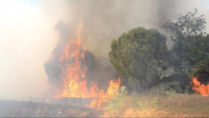 Tekirdağ'ın Çorlu ilçesinde çıkan yangında ormanlık alanda yüzlerce çam ağacı ile 300 dönüm anız alev alev yandı. Yangın, itfaiye ve polis TOMA'sı tarafından müdahale edilerek kontrol altına alındı.