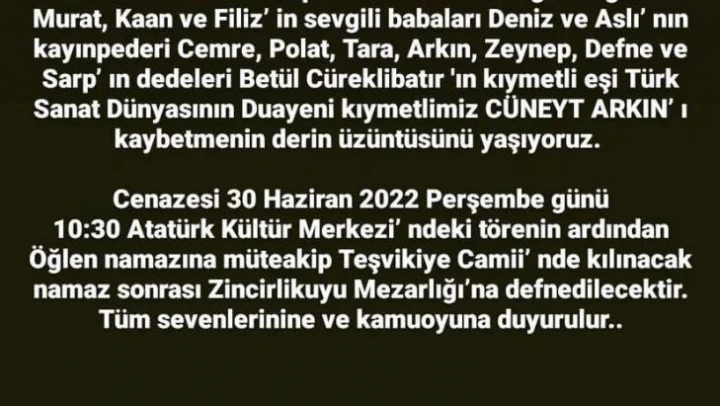 Cüneyt Arkın'ın hesabı üzerinden ailesi cenazeye ilişkin açıklamada bulundu.