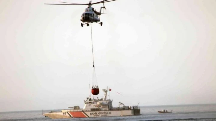 Jandarma Skorsky helikopterlerinin yanında 1 amfibik CL-215, 1 Antonov-32 tanker uçak ve 3 adet Air Tracktor yangın söndürme uçağı olmak üzere yoğun duman kaplı alanlara su atıyor.