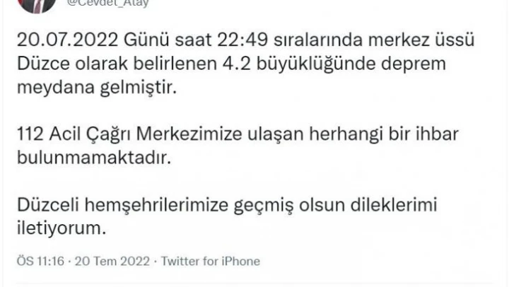 Düzce'de 22.49 sıralarında 4.2 büyüklüğünde deprem meydana geldi. Deprem sonrası Düzce Valisi Cevdet Atay, sosyal medya hesabından açıklama yaptı. Atay açıklamasında, “Düzce'de saat 22:49 sıralarında merkez üssü Düzce olarak belirlenen 4.2 büyüklüğünde deprem meydana gelmiştir. 112 Acil Çağrı Merkezimize ulaşan herhangi bir ihbar bulunmamaktadır. Düzceli hemşehrilerimize geçmiş olsun dileklerimi iletiyorum” dedi.