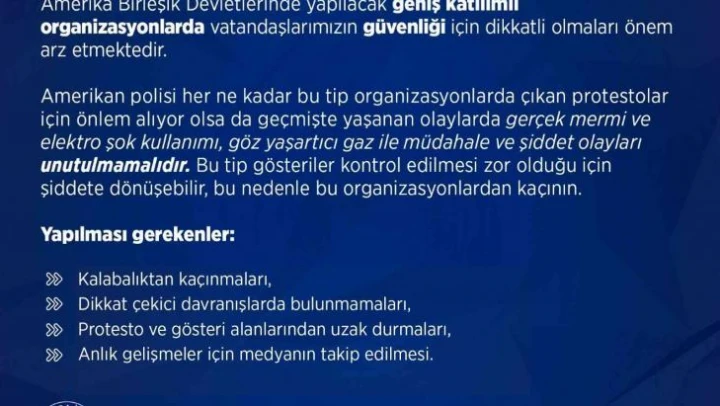 Emniyet Genel Müdürlüğü, sosyal medya hesabından, Amerika Birleşik Devletlerinde yapılacak geniş katılımlı organizasyonlarla ilgili Türk vatandaşlarını uyardı. Uyarıda, Amerikan polisinin geniş katılımlı organizasyonlarda çıkan protestolar için önlem almasına karşın geçmişte yaşanan olaylarda gerçek mermi ve elektro şok kullanımı, göz yaşartıcı gaz ile müdahale ve şiddet olaylarının unutulmaması gerektiği vurgulandı. Bu tip gösterilerin kontrol edilmesinin zor olduğu belirtilen açıklamada, gösteriler şiddet eylemlerine dönüşebileceği için bu yerlerden kaçınılması gerektiği belirtildi.