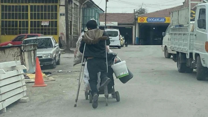 Eskişehir'de 15 yaşındaki gencin tek atağının engelli olması ve koltuk değnekleri ile zar zor iteleyerek götürdüğü aracıyla geri dönüşüm toplaması görenlerin yüreklerini sızlattı.