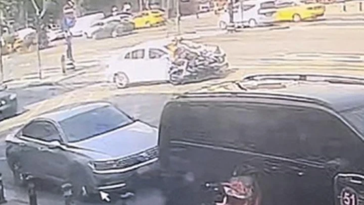 İstanbul Fatih'te ters yönden gelen motosikletli sürücü, yaya yolundan karşı şeride geçmek isteyince otomobil ile çarpıştı. Kazada, motosiklet sürücüsü ile arkasında oturan kadın yaralandı. Kaza anı ise bir iş yerinin güvenlik kameralarına yansıdı.