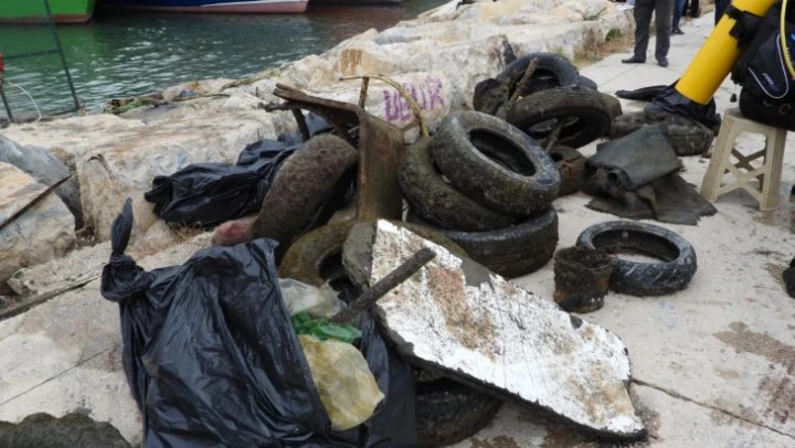 Sudan araba lastiği, plastik, cam şişe, sandalye gibi çok sayıda çöp çıkaran dalgıçlar, daha sonra çuvala koydukları atıkları kıyıya çıkardı.