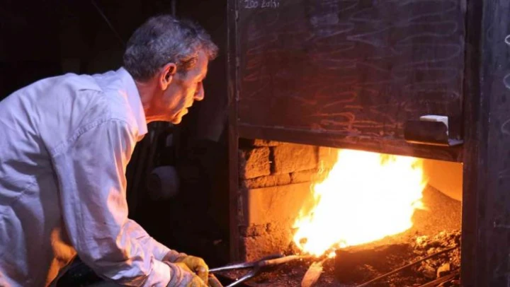 Malatya'da yaşayan 55 yaşındaki Aydın Bayyiğit, Bakırcılar Çarşısı'nda bulunan atölyesinde yaklaşık yarım asırdır bin 340 derecede erittiği demire şekil vererek ekmeğini kazanıyor.