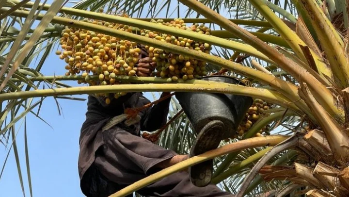 Hac ibadeti için Medine-i Münevvere'de bulunan hacılar, hurma hasadı dönemine denk gelmeleri vesilesi ile hurmaları dalından topluyor.