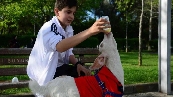 Kocaeli'de 'Huzur' ismini verdiği oğlağını yanından ayırmayan 12 yaşındaki Yusuf Can Öztaş, 3 aylık oyun arkadaşıyla yürüyüşe çıkıp, parkta oyun oynuyor. Renk renk kıyafet giydirilen ve biberonla beslenen Huzur, yüzlerde tebessüm oluşturuyor.