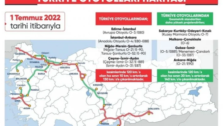 Yarın başlayacak uygulama ile Edirne-İstanbul (Avrupa Otoyolu), İstanbul-Ankara (Anadolu Otoyolu), Niğde-Mersin-Şanlıurfa (Niğde-Tarsus kesimi, Tarsus-Şanlıurfa kesimi) ile Çeşme-İzmir-Aydın (Çeşme-İzmir ile İzmir-Aydın kesimleri) otoyollarının mevcut olan 120 km/s olan hız sınırı 10 km/s artırılarak 130 km/s, Kuzey Marmara Otoyolu'nun Sakarya-Kurtköy-Odayeri-Kınalı bölümü, Malkara-Çanakkale, Gebze-İzmir/Menemen-Çandarlı, Ankara-Niğde otoyollarında ise 120 km/saat olan hız sınırı 20 km/saat artırılarak 140 km/saate çıkarıldı. Ayrıca yapımı devam eden ve yeni projelendirilecek otoyollar hizmete açıldıklarında 120 km/saat olan hız sınırı 20 km/saat artırılarak 140 km/saate yükseltilecek.