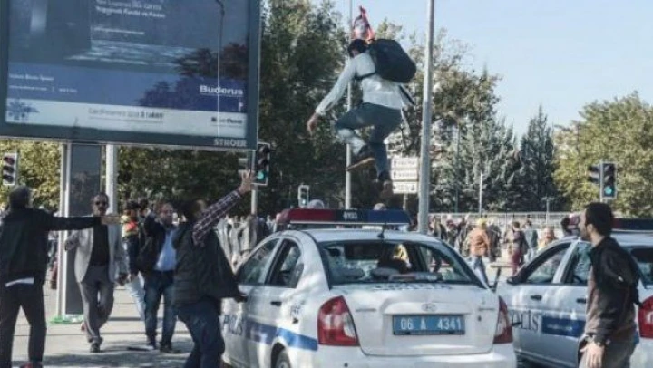 Ankara Sıhhıye meydanında yapılacak 'Emek, barış, demokrasi' mitinginin toplanma yeri olan Ankara Tren Garı önünde gerçekleşen canlı bombalı saldırısonrası alanda bulunan eylemciler polise ve polis araçlarına saldırdı.
