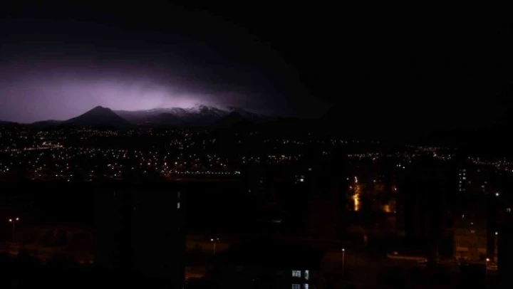 Kayseri'de etkili olan sağanak yağışla birlikte çakan şimşekler Erciyes Dağı'nı aydınlatırken, kartpostallık görüntüler ortaya çıktı.