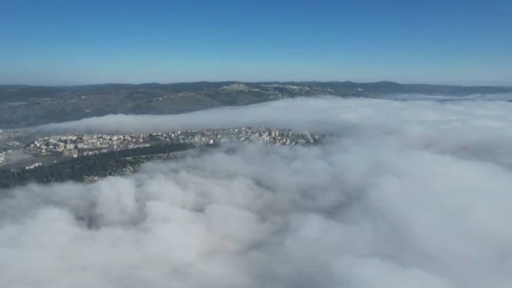 Kocaeli'de sabah saatlerinde etkisini gösteren sis havadan görüntülendi. Gökyüzünü kaplayan bulutların oluşturduğu eşsiz manzara da görenleri kendine hayran bıraktı. Sis bulutları zirvelerde görsel şölen sunarken, bulutların adeta dans eden görüntüsü ise havadan drone ile görüntülendi.