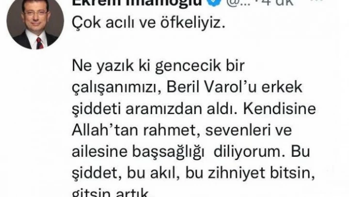 İBB Başkanı Ekrem İmamoğlu ise sosyal medya hesabından, “Çok acılı ve öfkeliyiz. Ne yazık ki gencecik bir çalışanımızı Beril Varol'u erkek şiddeti aramızdan aldı. Kendisine Allah'tan rahmet, sevenleri ve ailesine baş sağlığı diliyorum. Bu şiddet, bu akıl, bu zihniyet bitsin gitsin artık” açıklamasında bulundu.