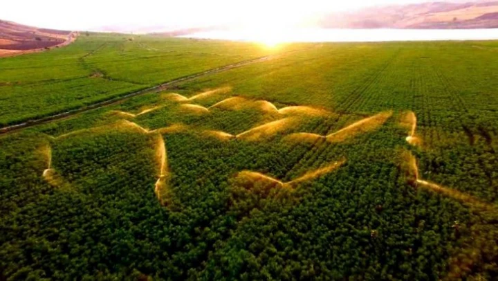 Tarladaki sulama gün batımı ile birleşti, ortaya güzel görüntüler çıktı