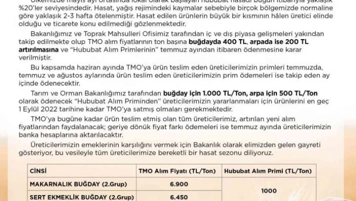 Ayrıca açıklamada haziran ayında TMO'ya ürün teslim eden üreticilerin primlerinin temmuzda; temmuz ve ağustos aylarında ürün teslim eden üreticilerin prim ödemelerinin ise takip eden ay içinde yapılacağı bildirildi. Bakanlık tarafından üreticilere “Tarım ve Orman Bakanlığımız tarafından buğday için bin lira/ton, arpa için 500 lira/ton olarak ödenecek hububat alım priminden üreticilerimizin yararlanmaları için ürünlerini en geç 1 Eylül 2022 tarihine kadar TMO'ya satmış olmaları gerekmektedir” uyarısı yapıldı.