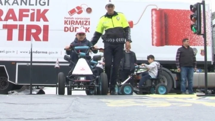 Eğitim parkında direksiyon parkına geçen Çınar'ın (7), 'Trafik eğitimi iyiydi ama şuna boyum biraz yetişmiyor. Trafik kurallarına uyuyorum. Pedala boyum yetmiyor' sözleri ise çevredekileri gülümsetti.