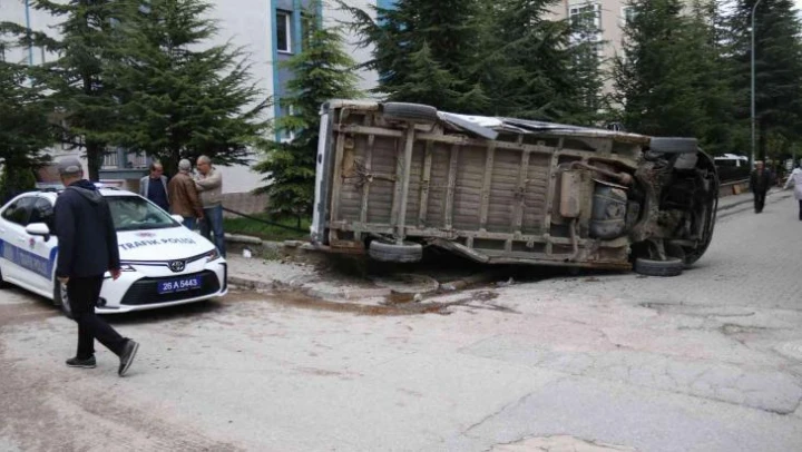 Eskişehir'de yolcu minibüsünün çarptığı panelvan araç yol kenarında bulunan siteye ait bahçenin duvarına devrildi.