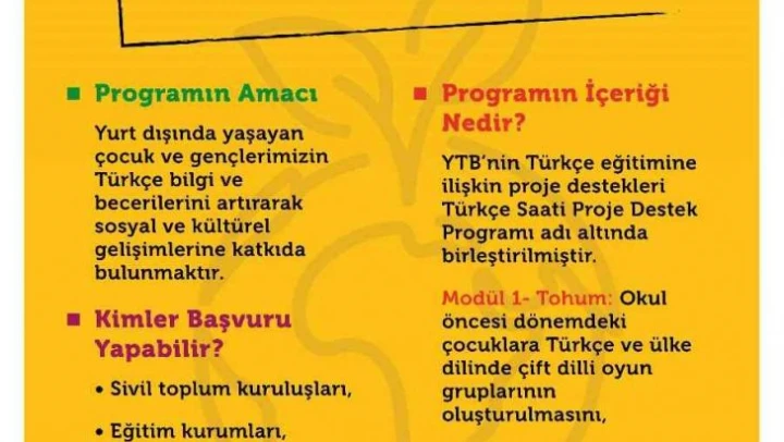 Kültür ve Turizm Bakanlığı Yurtdışı Türkler ve Akraba Topluluklar Başkanlığı (YTB) tarafından yurt dışında yaşayan çocuk ve gençlerin Türkçe bilgi ve becerilerini artırarak sosyal ve kültürel gelişimlerine katkı sağlamak amacıyla hayata geçirilen 'Türkçe Saati Proje Destek Programı'na (TSP) başvurular açıldı. Program ile yurt dışındaki yeni kuşağa Türkçe ve Türk kültürünü öğreten; sivil toplum kuruluşları, eğitim kurumları ve kar amacı gütmeyen kuruluşlar desteklenecek. YTB ilan ettiği bu programla, yurt dışındaki sivil toplum kuruluşlarının kendi imkanlarıyla yıllardır sürdürdükleri Türkçe eğitim çalışmalarını desteklerken aynı zamanda kuruluşların kurumsallaşmasına da katkı sağlıyor.