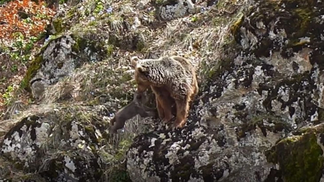 Tunceli'de anne ve yavru boz ayı görüntülendi. Anne ayının yavrusunu zorlu yerlerde ağzıyla taşıması dikkat çekti.