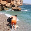 Antalya'nın dünyaca ünlü Konyaaltı sahiline ölü caretta caretta cinsi deniz kaplumbağası vurdu. Su içindeki caretta carettaya taş atan çocuklar, çevreye ağır bir koku yayan kaplumbağa ölüsünü kıyıya çıkardı.