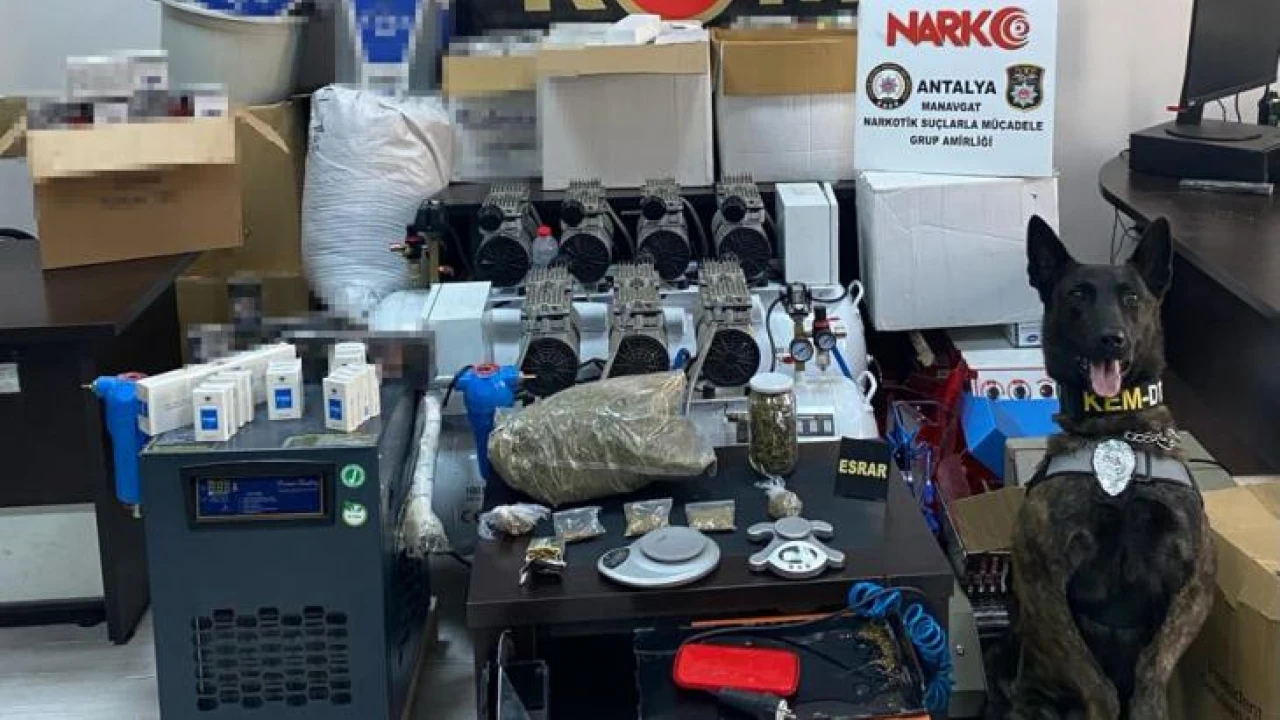 Manavgat İlçe Emniyet Müdürlüğü Kaçakçılık ve Organize Suçlarla Mücadele Grup Amirliği ve Narkotik Suçlarla Mücadele Grup Amirliği ekipleri tarafından Manavgat’taki bir ikamete ortak operasyon düzenlendi. Eve yapılan aramalarda 725 gram esrar, 2 hassas terazi, 4 sigara sarma makinesi, 2 sigara sarmak için kullanılan hava kompresörü, sigara sarmada kullanılan basınçlı hava kurtarma makinası, 46 bin adet içi tütünle doldurulmuş makaron, 78 kilo kıyılmış tütün, 313 paket (200’erli) boş makaron ve 50 paket gümrük kaçağı sigara ele geçirildi.