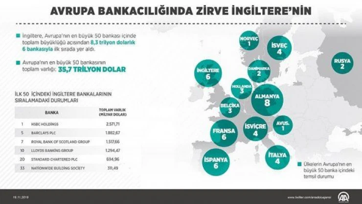 İngiltere, Avrupa'nın en büyük 50 bankası içinde toplam büyüklüğü açısından 8,3 trilyon dolarlık 6 bankasıyla ilk sırada yer aldı.