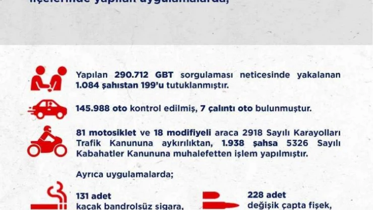 Ankara Emniyet Müdürlüğü ekiplerince 9-16 Haziran tarihleri arasında Altındağ, Çankaya, Keçiören, Mamak, Yenimahalle ve Pursaklar ilçelerinde asayiş uygulaması gerçekleştirildi. Yapılan çalışmalarda 290 bin 712 kişinin yapılan GBT sorgulamasında yakalanan bin 84 şahıstan 199’u tutuklandı. Kontrol edilen 145 bin 988 araçtan ise 7 otomobilin çalıntı olduğu belirlenirken, 81 motosiklet ve 18 modifiyeli araca adli işlem yapıldı. Uygulamada bin 938 şahsa da Kabahatler Kanunu’na muhalefetten işlem yapıldı.