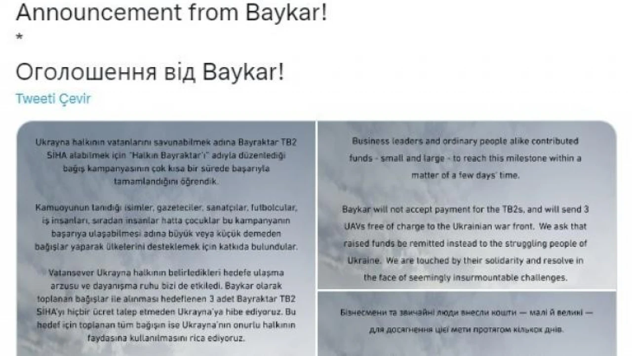 Baykar’ın sosyal medya hesabından yaptığı duyuruda, "Kamuoyunun tanıdığı isimler, gazeteciler, sanatçılar, futbolcular, iş insanları, sıradan insanlar, hatta çocuklar bu kampanyanın başarıya ulaşabilmesi adına büyük veya küçük demeden bağışlar yaparak ülkelerini desteklemek için katkıda bulundular. Vatansever Ukrayna halkının belirledikleri hedefe ulaşma arzusu ve dayanışma ruhu bizi de etkiledi. Baykar olarak toplanan bağışlar ile alınması hedeflenen 3 adet Bayraktar TB2 SİHA’yı hiçbir ücret talep etmeden Ukrayna’ya hibe ediyoruz. Bu hedef için toplanan tüm bağışın ise Ukrayna’nın onurlu halkının faydasına kullanılmasını rica ediyoruz" ifadelerine yer verildi.