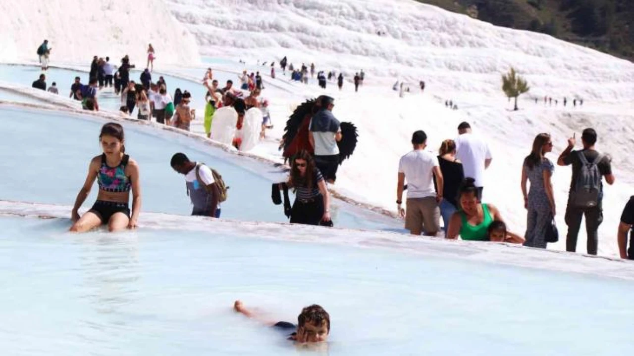 Termal suları ve çevresindeki antik kentlerle her mevsim ziyaretçi ağırlayan UNESCO Dünya Miras Listesi’nde yer alan beyaz cennet Pamukkale Travertenleri’de Ramazan Bayramı nedeniyle yoğunluk oluştu. Tatili fırsat bilen yerli ve yabancı ziyaretçilerin akın ettiği travertenlerde ara ara meydana gelen kuyruk renkli görüntülere sahne oldu. Kleopatra Antik Havuzunda hava sıcaklığına aldırış etmeyen vatandaşlar termal suda yüzerek anın tadını çıkardı. Farklı iller ve ülkelerden Pamukkale’ye gelen turistler bayramda bol bol fotoğraf çekilerek anı ölümsüzleştirmeyi ihmal etmedi.