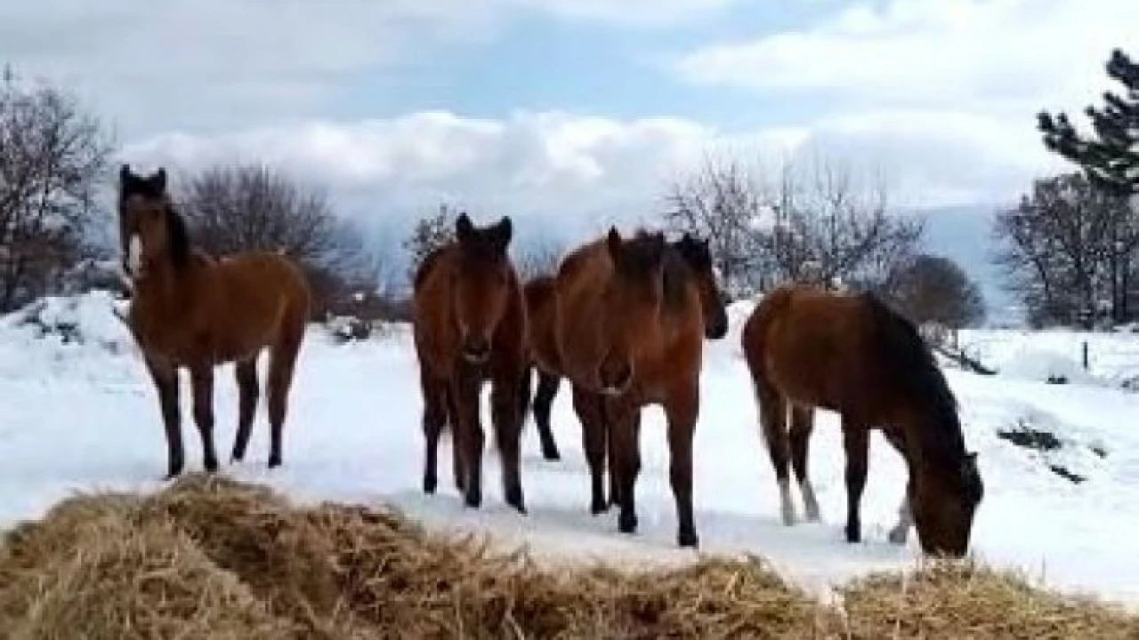 Bolu'da kar kalınlığının 1 metreye yaklaştığı ormanlık alanlarda aç kalan yılkı atları için yemleme çalışması yapıldı.